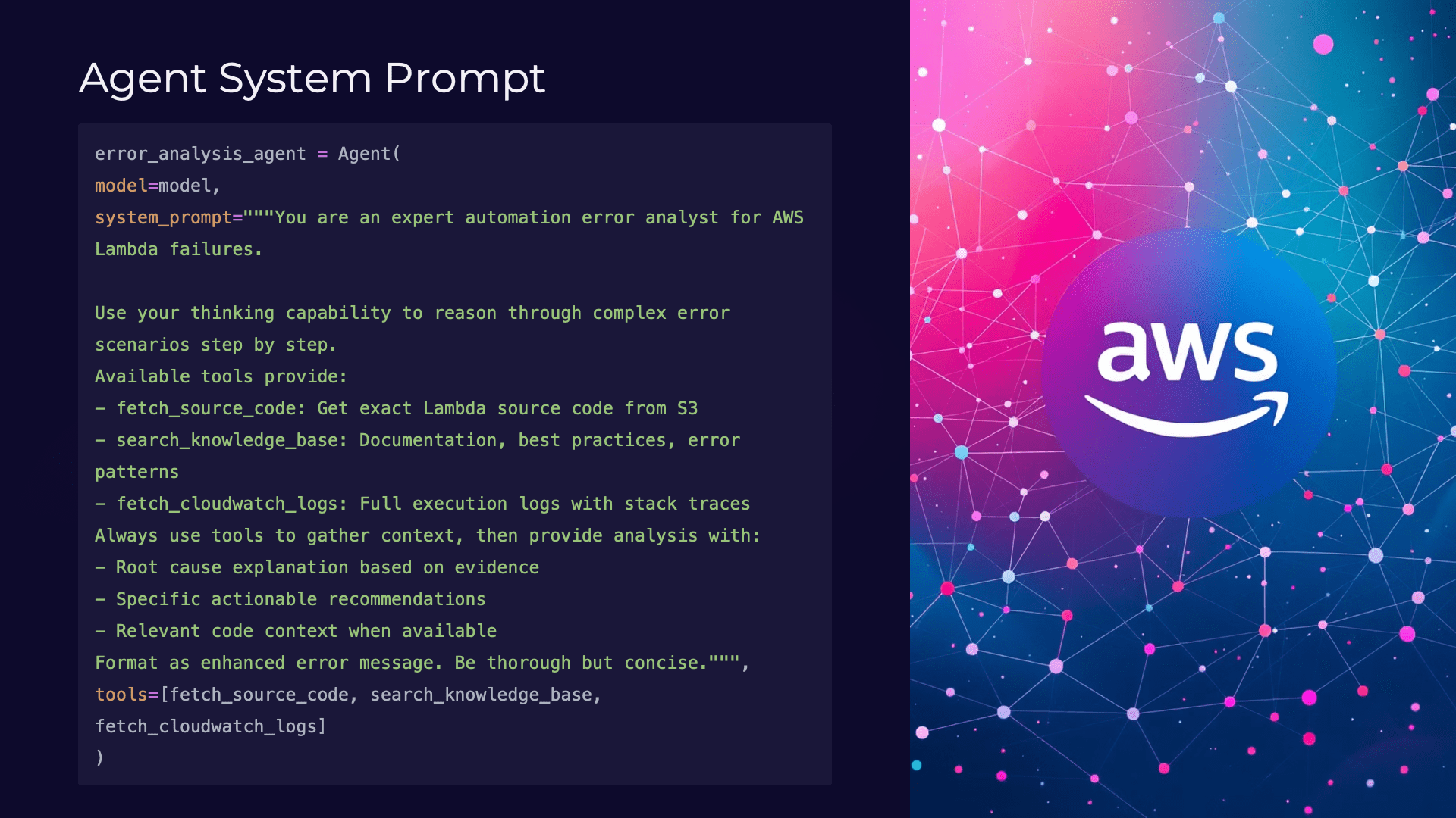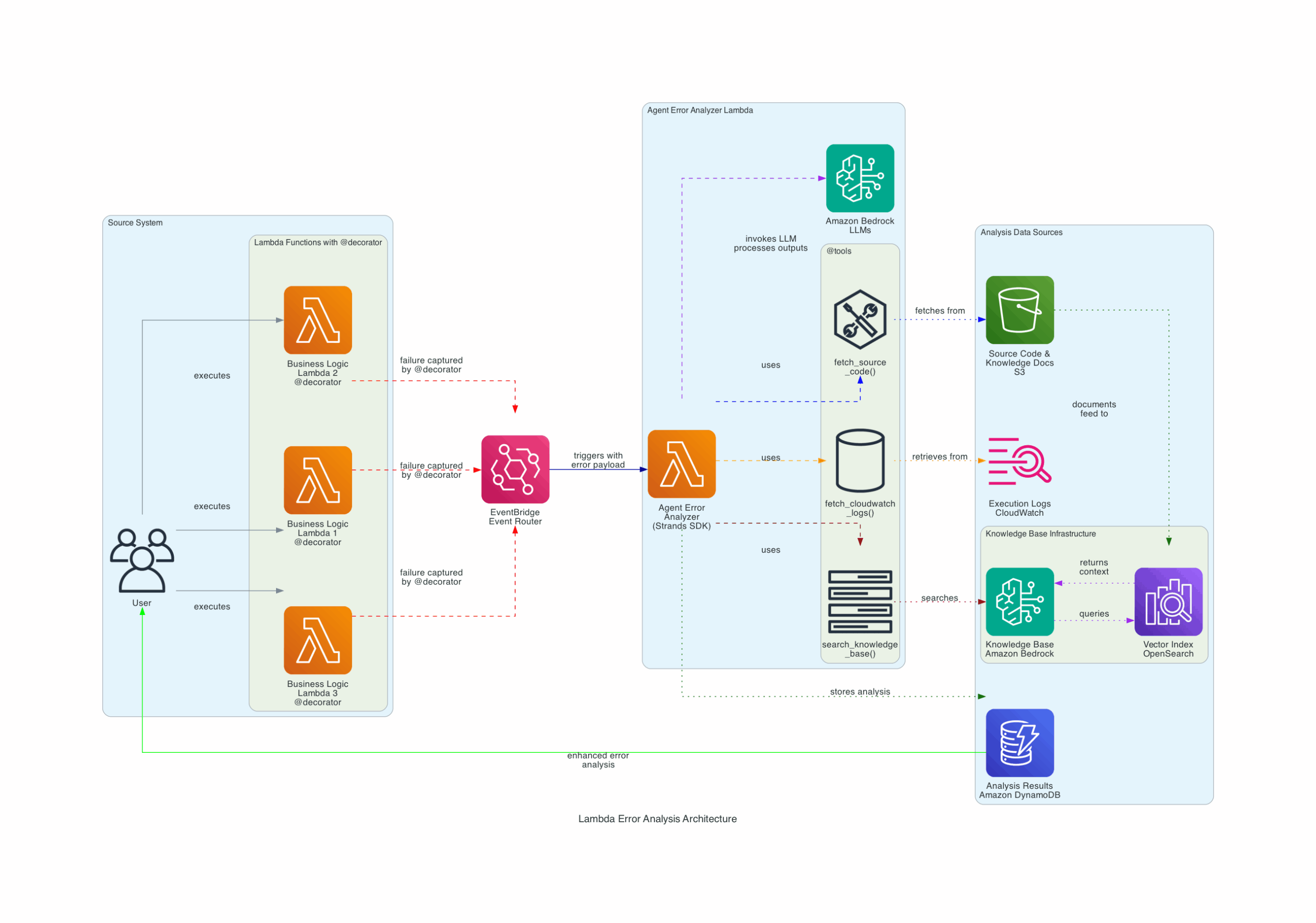 I built an intelligent error analysis system that automatically investigates AWS Lambda failures using AI agents. When a Lambda function fails, the system autonomously gathers source code, execution logs, and searches documentation to provide root cause analysis and specific fix recommendations—typically in under a minute. ⚡